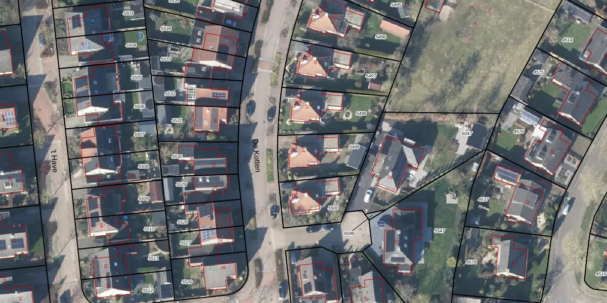 Het perceel waarop De Kotten 19 staat heeft een oppervlakte van 428 m². Dit is een groot perceel. De perceeloppervlakte wordt geregistreerd door het Kadaster. Gedetailleerde informatie over de maten van dit perceel kunt u vinden in het rapport Kadastrale kaart met maatvoering van De Kotten 19.