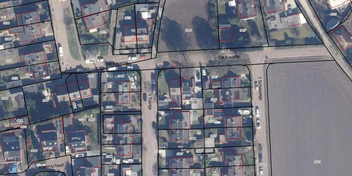 Het perceel waarop De Kwartel 5 staat heeft een oppervlakte van 314 m². Dit is een groot perceel. De perceeloppervlakte wordt geregistreerd door het Kadaster. Gedetailleerde informatie over de maten van dit perceel kunt u vinden in het rapport Kadastrale kaart met maatvoering van De Kwartel 5.