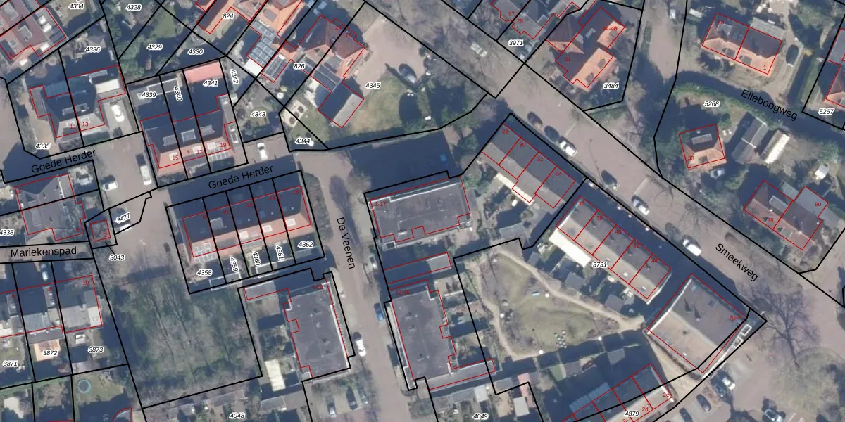 De Veenen 15 is gelegen op kadastraal perceel LRN01G4049. Deze kadastrale aanduiding is uniek en wordt gebruikt door het Kadaster om eigendomsrechten en andere zakelijke rechten vast te leggen. Het perceel maakt onderdeel uit van de kadastrale gemeente Laren Noord-Holland.