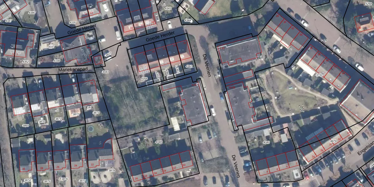 De Veenen 16 is gelegen op kadastraal perceel LRN01G4048. Deze kadastrale aanduiding is uniek en wordt gebruikt door het Kadaster om eigendomsrechten en andere zakelijke rechten vast te leggen. Het perceel maakt onderdeel uit van de kadastrale gemeente Laren Noord-Holland.