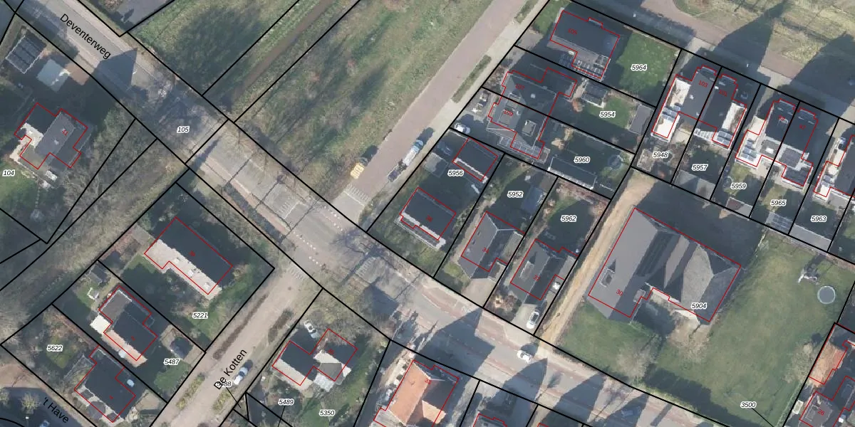 Deventerweg 36 is gelegen op kadastraal perceel LRN02C5956. Deze kadastrale aanduiding is uniek en wordt gebruikt door het Kadaster om eigendomsrechten en andere zakelijke rechten vast te leggen. Het perceel maakt onderdeel uit van de kadastrale gemeente Laren Gelderland.