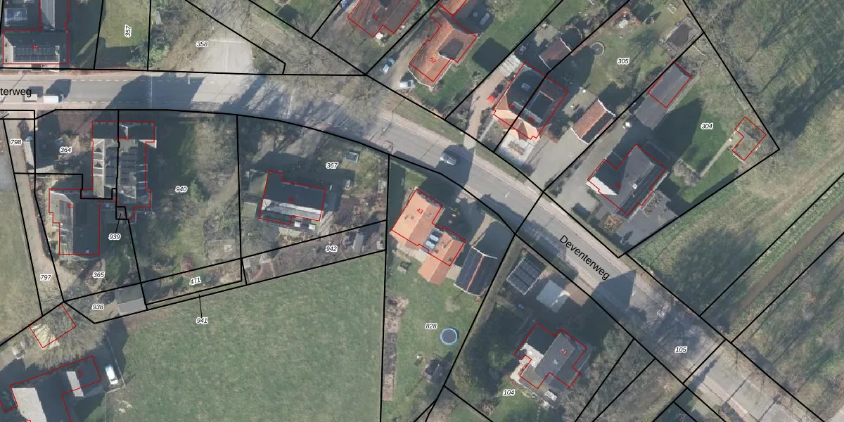 Deventerweg 43 is gelegen op kadastraal perceel LCM00Z828. Deze kadastrale aanduiding is uniek en wordt gebruikt door het Kadaster om eigendomsrechten en andere zakelijke rechten vast te leggen. Het perceel maakt onderdeel uit van de kadastrale gemeente Lochem.