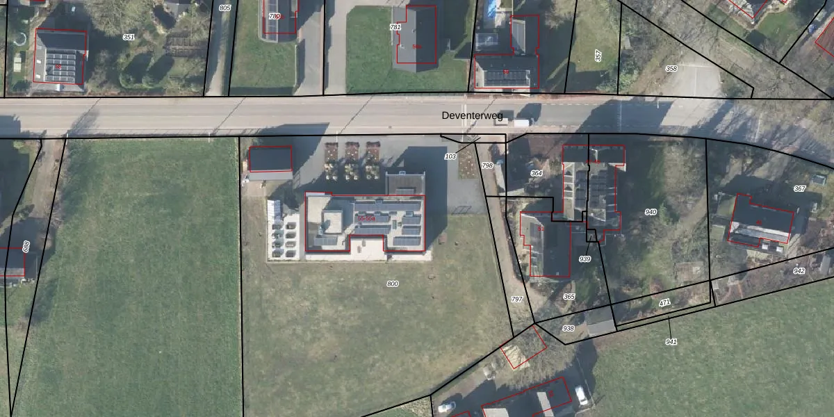 Het perceel waarop Deventerweg 55-a staat heeft een oppervlakte van 4015 m². Dit is een zeer groot perceel. De perceeloppervlakte wordt geregistreerd door het Kadaster. Gedetailleerde informatie over de maten van dit perceel kunt u vinden in het rapport Kadastrale kaart met maatvoering van Deventerweg 55-a.