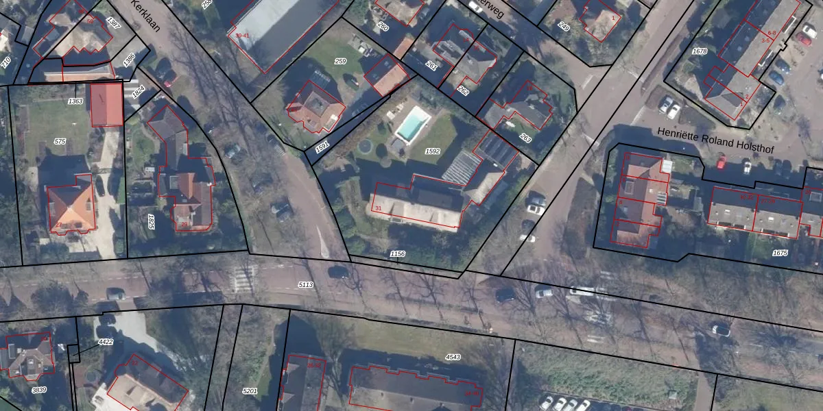 Het adres ligt op het perceel LRN01-F-1592, dat zich in de kadastrale gemeente Laren Noord-Holland bevindt. Het perceel is 1608 m² groot. Dat is kleiner dan de gemiddelde perceeloppervlakte in Laren Noord-Holland, dat op 1839,81 m² ligt. Het grootste perceel in de kadastrale gemeente is 1,24 km². Het kleinste perceel heeft een oppervlakte van 0 m². Dit is het enige adres dat aanwezig is op het perceel. In de Basisregistratie Kadaster (BRK) werden de grenzen van het perceel geregistreerd op 23-11-1999.