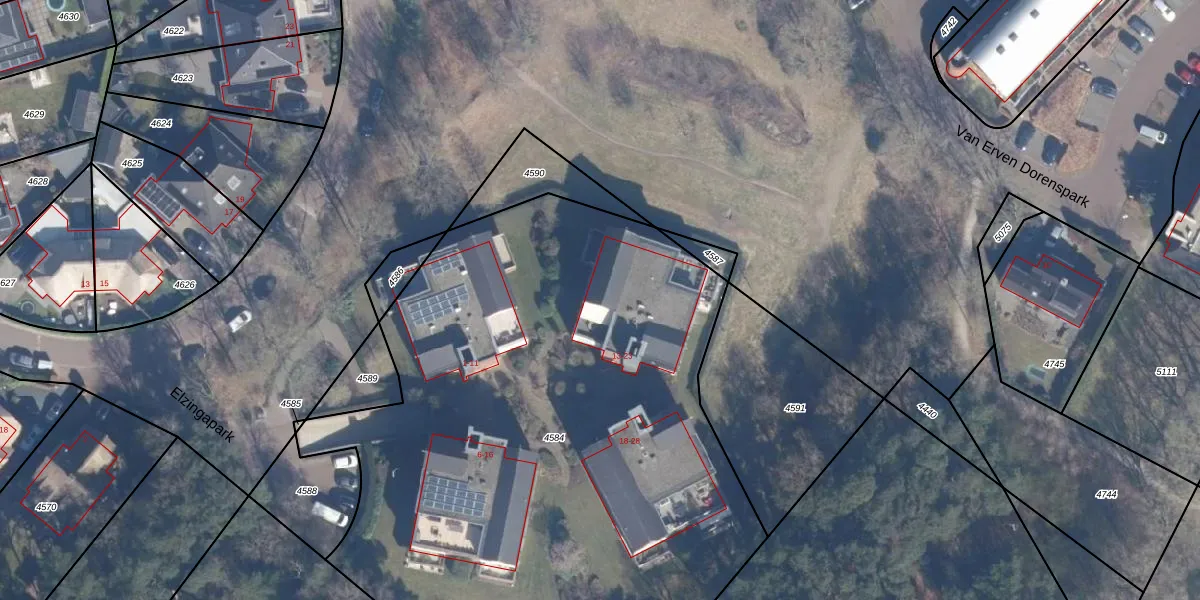 Het perceel waarop Elzingapark 19 staat heeft een oppervlakte van 4485 m². Dit is een zeer groot perceel. De perceeloppervlakte wordt geregistreerd door het Kadaster. Gedetailleerde informatie over de maten van dit perceel kunt u vinden in het rapport Kadastrale kaart met maatvoering van Elzingapark 19.