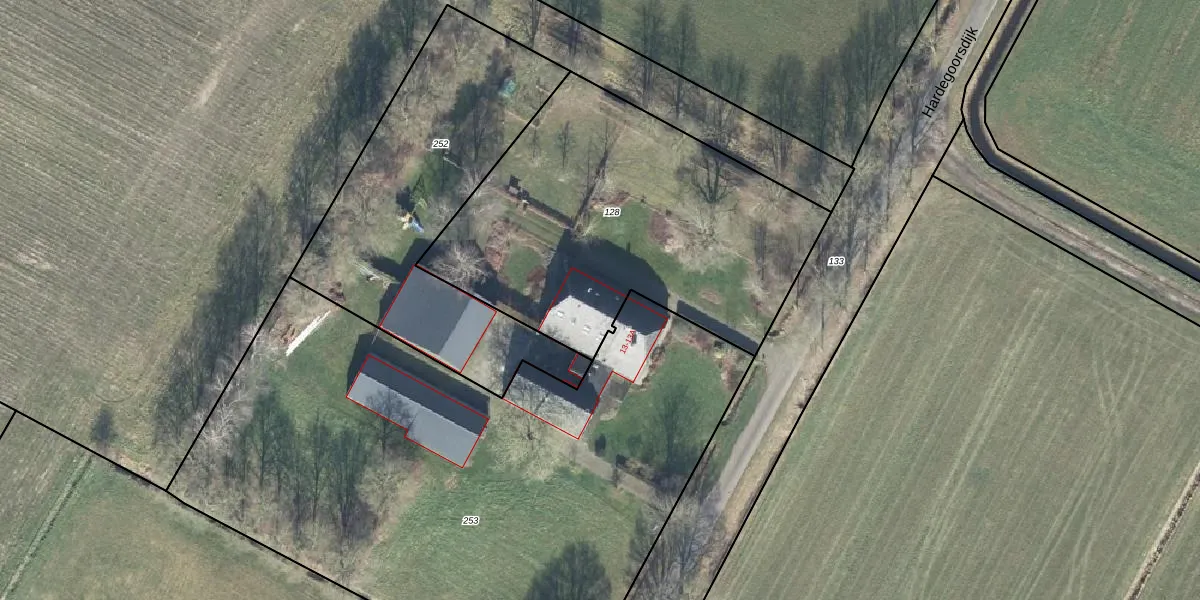 Het perceel waarop Hardegoorsdijk 13-a staat heeft een oppervlakte van 1853 m². Dit is een zeer groot perceel. De perceeloppervlakte wordt geregistreerd door het Kadaster. Gedetailleerde informatie over de maten van dit perceel kunt u vinden in het rapport Kadastrale kaart met maatvoering van Hardegoorsdijk 13-a.