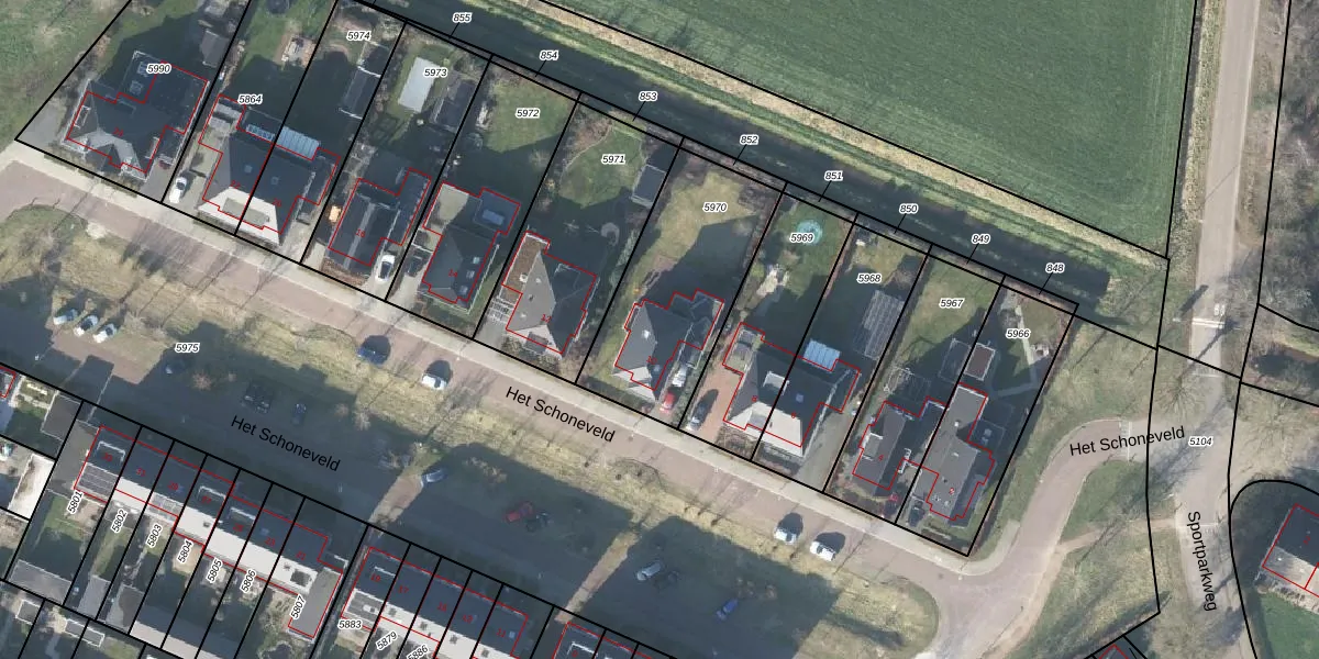 Het Schoneveld 10 is gelegen op kadastraal perceel LRN02C5970. Deze kadastrale aanduiding is uniek en wordt gebruikt door het Kadaster om eigendomsrechten en andere zakelijke rechten vast te leggen. Het perceel maakt onderdeel uit van de kadastrale gemeente Laren Gelderland.