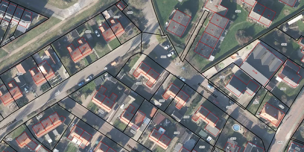 Het perceel waarop Koeslagstraat 9 staat heeft een oppervlakte van 608 m². Dit is een groot perceel. De perceeloppervlakte wordt geregistreerd door het Kadaster. Gedetailleerde informatie over de maten van dit perceel kunt u vinden in het rapport Kadastrale kaart met maatvoering van Koeslagstraat 9.