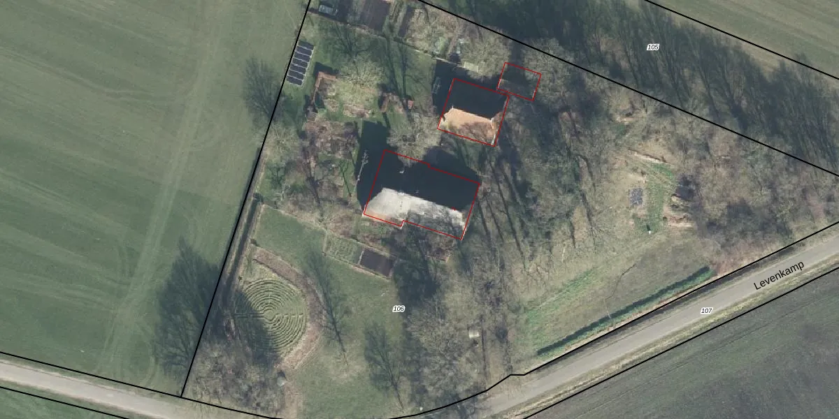 Het perceel waarop Levenkamp 2 staat heeft een oppervlakte van 9931 m². Dit is een zeer groot perceel. De perceeloppervlakte wordt geregistreerd door het Kadaster. Gedetailleerde informatie over de maten van dit perceel kunt u vinden in het rapport Kadastrale kaart met maatvoering van Levenkamp 2.