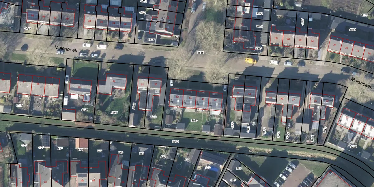 Het perceel waarop Molenbeek 51 staat heeft een oppervlakte van 918 m². Dit is een groot perceel. De perceeloppervlakte wordt geregistreerd door het Kadaster. Gedetailleerde informatie over de maten van dit perceel kunt u vinden in het rapport Kadastrale kaart met maatvoering van Molenbeek 51.