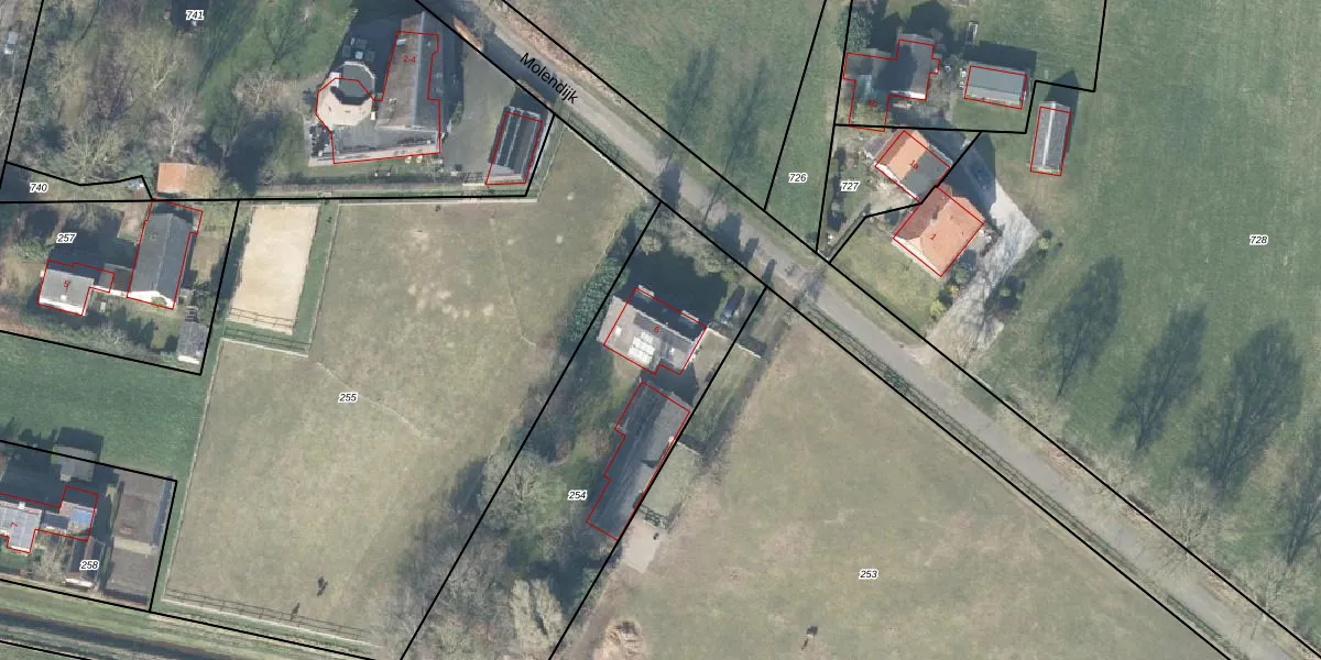 Het perceel waarop Molendijk 6 staat heeft een oppervlakte van 1529 m². Dit is een zeer groot perceel. De perceeloppervlakte wordt geregistreerd door het Kadaster. Gedetailleerde informatie over de maten van dit perceel kunt u vinden in het rapport Kadastrale kaart met maatvoering van Molendijk 6.