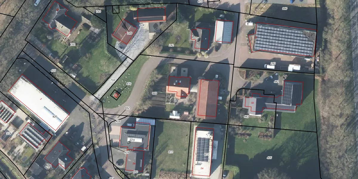 Het perceel waarop Molenveld 30 staat heeft een oppervlakte van 2183 m². Dit is een zeer groot perceel. De perceeloppervlakte wordt geregistreerd door het Kadaster. Gedetailleerde informatie over de maten van dit perceel kunt u vinden in het rapport Kadastrale kaart met maatvoering van Molenveld 30.