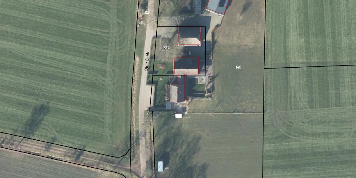 Het perceel waarop Olde Diek 2-a staat heeft een oppervlakte van 7015 m². Dit is een zeer groot perceel. De perceeloppervlakte wordt geregistreerd door het Kadaster. Gedetailleerde informatie over de maten van dit perceel kunt u vinden in het rapport Kadastrale kaart met maatvoering van Olde Diek 2-a.