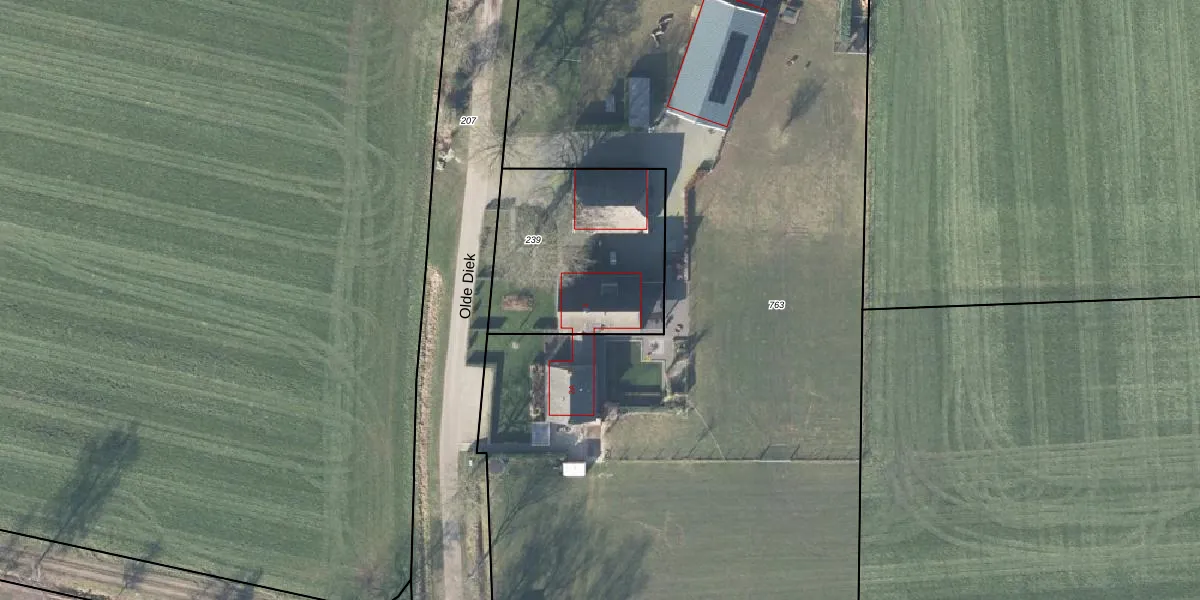 Het perceel waarop Olde Diek 2 staat heeft een oppervlakte van 780 m². Dit is een groot perceel. De perceeloppervlakte wordt geregistreerd door het Kadaster. Gedetailleerde informatie over de maten van dit perceel kunt u vinden in het rapport Kadastrale kaart met maatvoering van Olde Diek 2.
