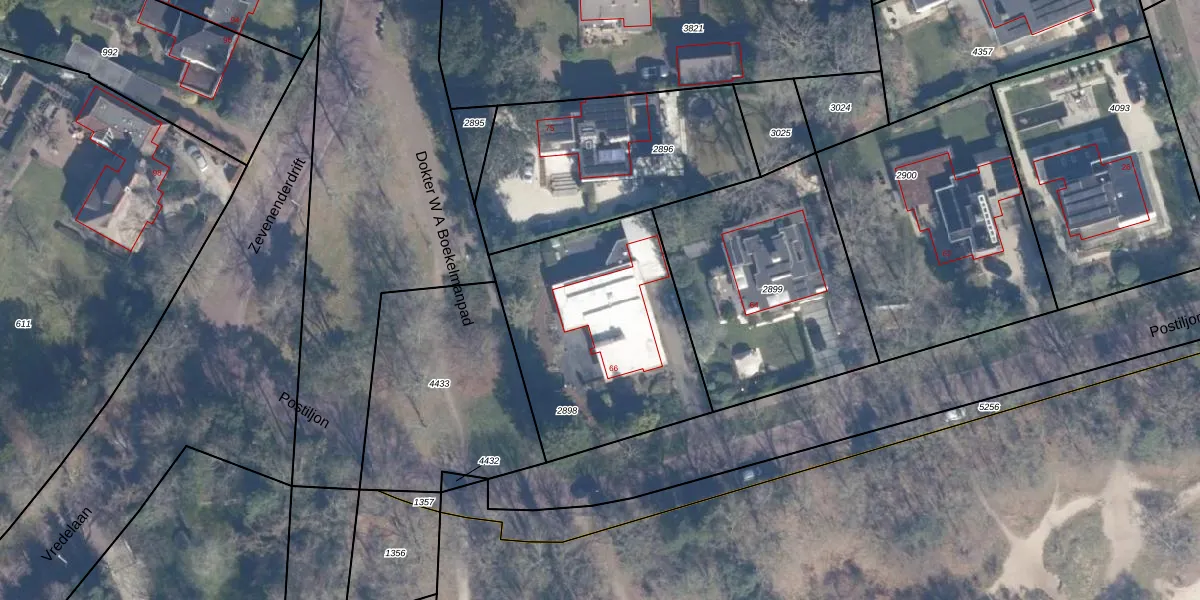 Het perceel waarop Postiljon 66 staat heeft een oppervlakte van 1014 m². Dit is een zeer groot perceel. De perceeloppervlakte wordt geregistreerd door het Kadaster. Gedetailleerde informatie over de maten van dit perceel kunt u vinden in het rapport Kadastrale kaart met maatvoering van Postiljon 66.