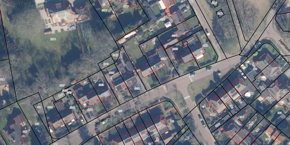 Het perceel waarop Ruiterweg 35 staat heeft een oppervlakte van 1519 m². Dit is een zeer groot perceel. De perceeloppervlakte wordt geregistreerd door het Kadaster. Gedetailleerde informatie over de maten van dit perceel kunt u vinden in het rapport Kadastrale kaart met maatvoering van Ruiterweg 35.