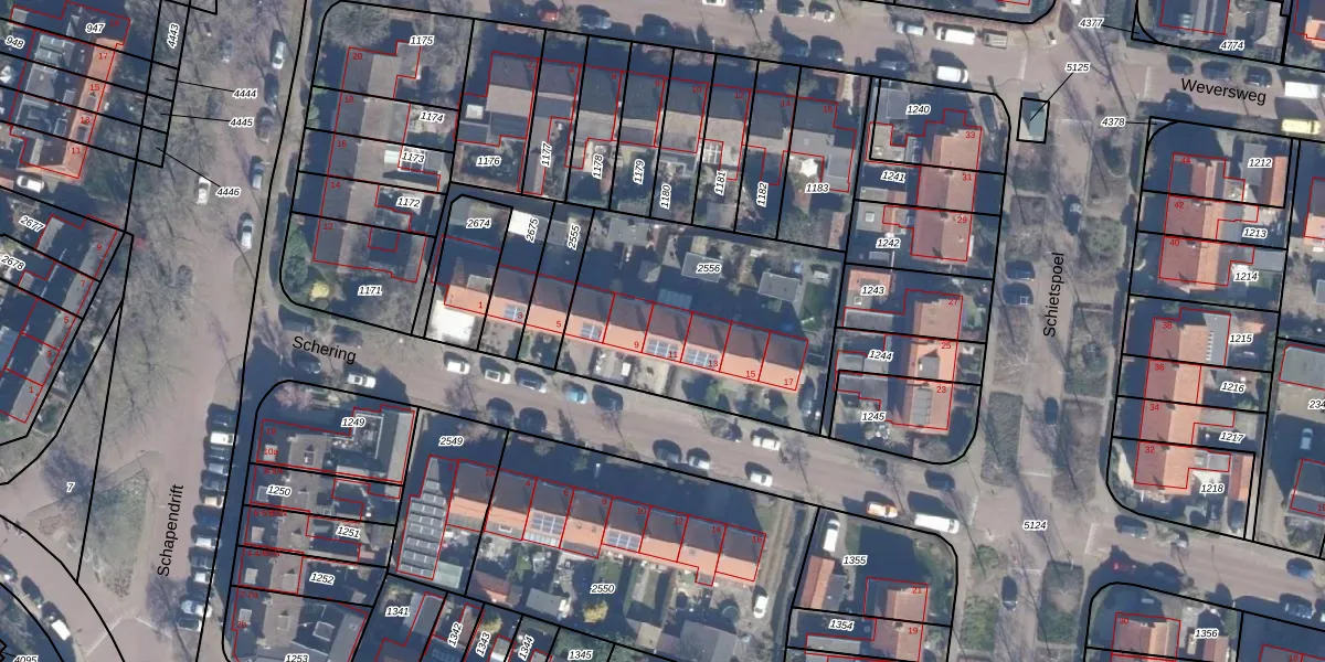 Het perceel waarop Schering 11 staat heeft een oppervlakte van 1065 m². Dit is een zeer groot perceel. De perceeloppervlakte wordt geregistreerd door het Kadaster. Gedetailleerde informatie over de maten van dit perceel kunt u vinden in het rapport Kadastrale kaart met maatvoering van Schering 11.