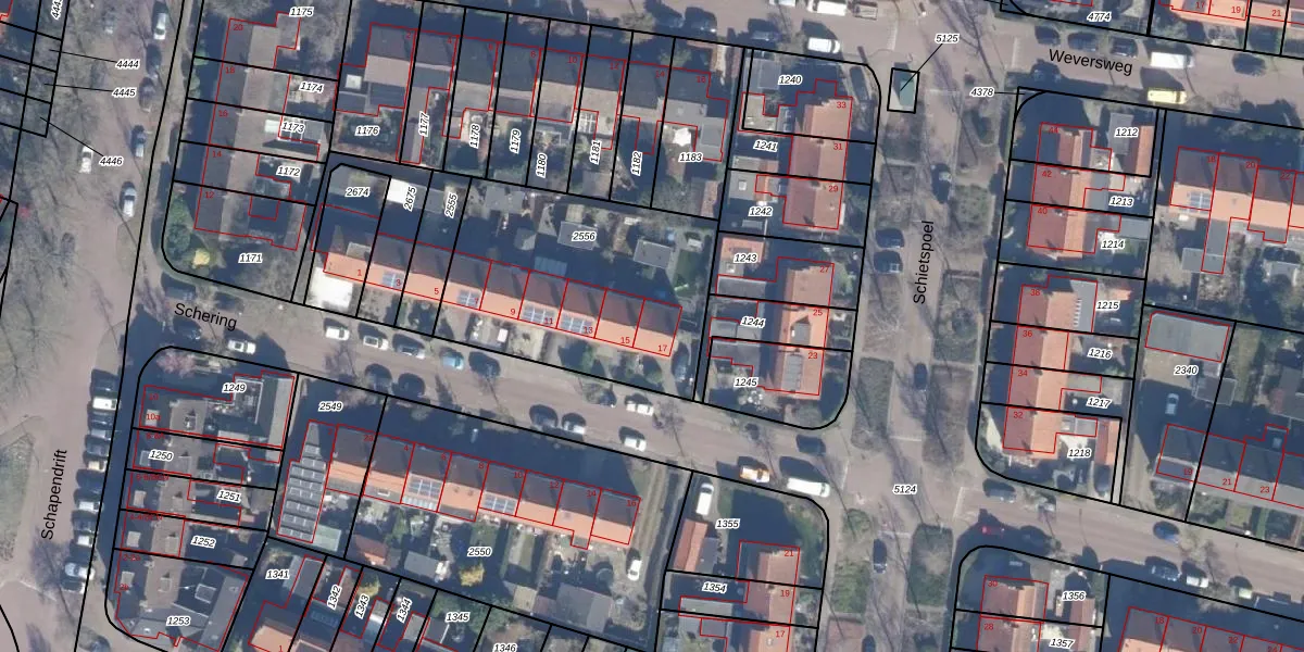 Het perceel waarop Schering 17 staat heeft een oppervlakte van 1065 m². Dit is een zeer groot perceel. De perceeloppervlakte wordt geregistreerd door het Kadaster. Gedetailleerde informatie over de maten van dit perceel kunt u vinden in het rapport Kadastrale kaart met maatvoering van Schering 17.