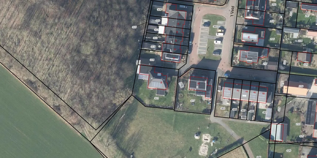 Het perceel waarop 't Veld 36 staat heeft een oppervlakte van 665 m². Dit is een groot perceel. De perceeloppervlakte wordt geregistreerd door het Kadaster. Gedetailleerde informatie over de maten van dit perceel kunt u vinden in het rapport Kadastrale kaart met maatvoering van 't Veld 36.