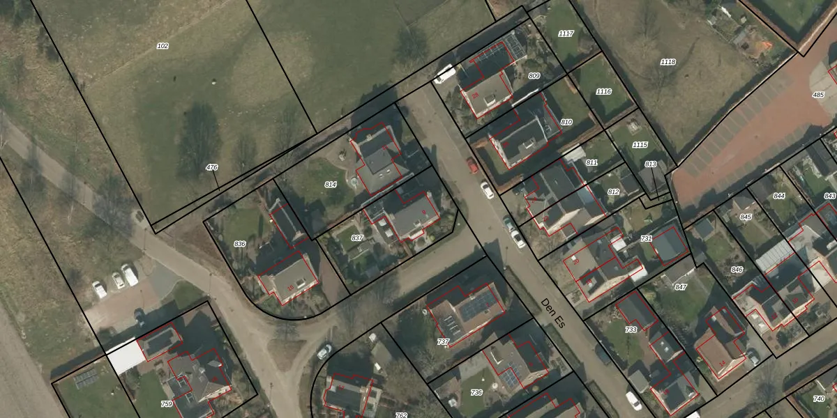 Het perceel waarop Den Es 9 staat heeft een oppervlakte van 519 m². Dit is een groot perceel. De perceeloppervlakte wordt geregistreerd door het Kadaster. Gedetailleerde informatie over de maten van dit perceel kunt u vinden in het rapport Kadastrale kaart met maatvoering van Den Es 9.