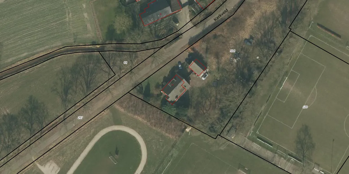 Kerkveld 7 is gelegen op kadastraal perceel OLO00K594. Deze kadastrale aanduiding is uniek en wordt gebruikt door het Kadaster om eigendomsrechten en andere zakelijke rechten vast te leggen. Het perceel maakt onderdeel uit van de kadastrale gemeente Oploo.