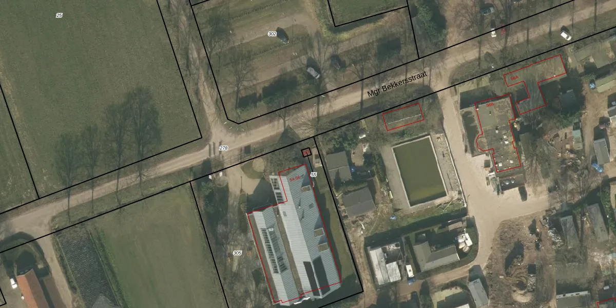 Mgr Bekkersstraat 56-T is gelegen op kadastraal perceel OLO00K55. Deze kadastrale aanduiding is uniek en wordt gebruikt door het Kadaster om eigendomsrechten en andere zakelijke rechten vast te leggen. Het perceel maakt onderdeel uit van de kadastrale gemeente Oploo.