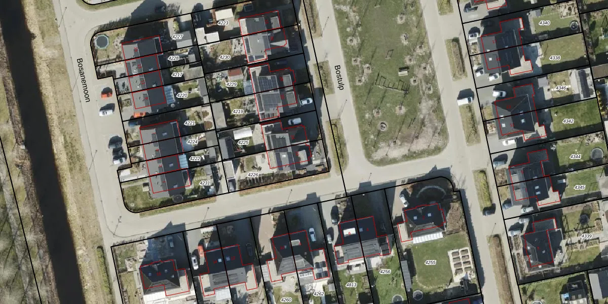 Het perceel waarop Bostulp 22 staat heeft een oppervlakte van 366 m². Dit is een groot perceel. De perceeloppervlakte wordt geregistreerd door het Kadaster. Gedetailleerde informatie over de maten van dit perceel kunt u vinden in het rapport Kadastrale kaart met maatvoering van Bostulp 22.