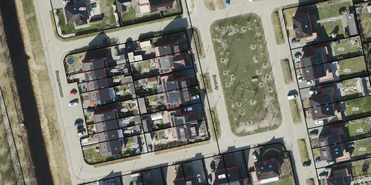 Het perceel waarop Bostulp 26 staat heeft een oppervlakte van 323 m². Dit is een groot perceel. De perceeloppervlakte wordt geregistreerd door het Kadaster. Gedetailleerde informatie over de maten van dit perceel kunt u vinden in het rapport Kadastrale kaart met maatvoering van Bostulp 26.