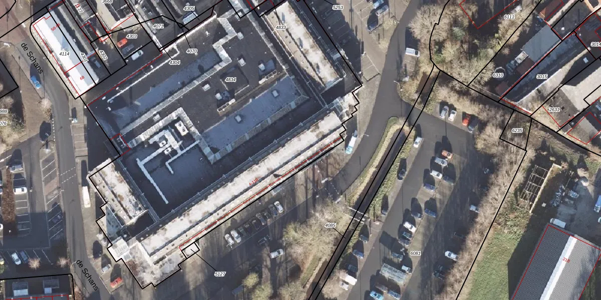 Het perceel waarop de Schans 104 staat heeft een oppervlakte van 5256 m². Dit is een zeer groot perceel. De perceeloppervlakte wordt geregistreerd door het Kadaster. Gedetailleerde informatie over de maten van dit perceel kunt u vinden in het rapport Kadastrale kaart met maatvoering van de Schans 104.
