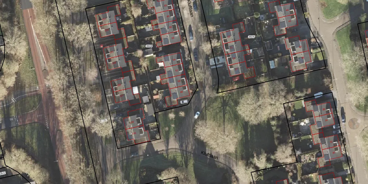 Het perceel waarop Kluftlaan 48 staat heeft een oppervlakte van 3472 m². Dit is een zeer groot perceel. De perceeloppervlakte wordt geregistreerd door het Kadaster. Gedetailleerde informatie over de maten van dit perceel kunt u vinden in het rapport Kadastrale kaart met maatvoering van Kluftlaan 48.