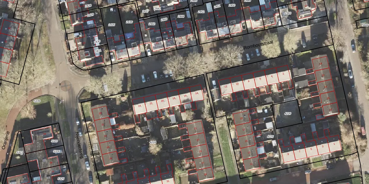 Het perceel waarop Romboutstraat 16 staat heeft een oppervlakte van 4020 m². Dit is een zeer groot perceel. De perceeloppervlakte wordt geregistreerd door het Kadaster. Gedetailleerde informatie over de maten van dit perceel kunt u vinden in het rapport Kadastrale kaart met maatvoering van Romboutstraat 16.