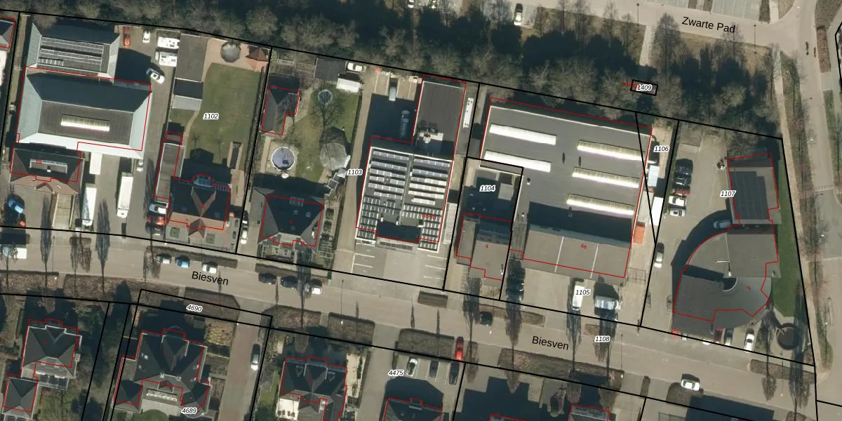 Het perceel waarop Biesven 6-b staat heeft een oppervlakte van 2502 m². Dit is een zeer groot perceel. De perceeloppervlakte wordt geregistreerd door het Kadaster. Gedetailleerde informatie over de maten van dit perceel kunt u vinden in het rapport Kadastrale kaart met maatvoering van Biesven 6-b.