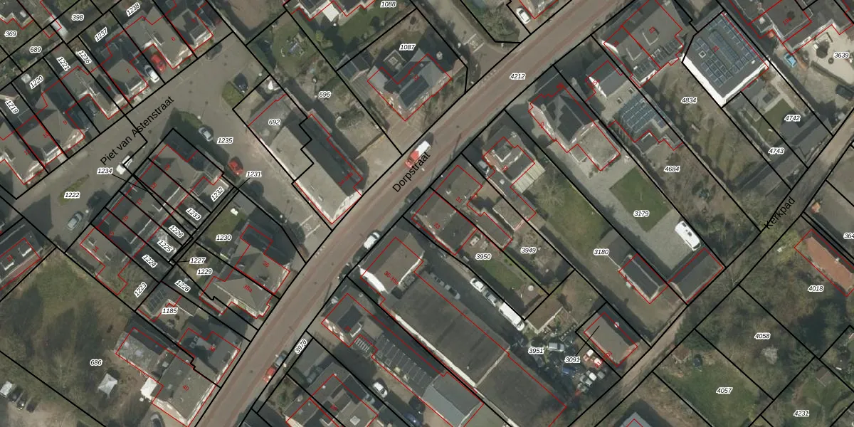Dorpstraat 33 is gelegen op kadastraal perceel LDE01A3950. Deze kadastrale aanduiding is uniek en wordt gebruikt door het Kadaster om eigendomsrechten en andere zakelijke rechten vast te leggen. Het perceel maakt onderdeel uit van de kadastrale gemeente Leende.