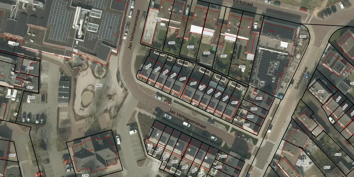 Jan Verhoevenstraat 9 is gelegen op kadastraal perceel LDE01A4844. Deze kadastrale aanduiding is uniek en wordt gebruikt door het Kadaster om eigendomsrechten en andere zakelijke rechten vast te leggen. Het perceel maakt onderdeel uit van de kadastrale gemeente Leende.