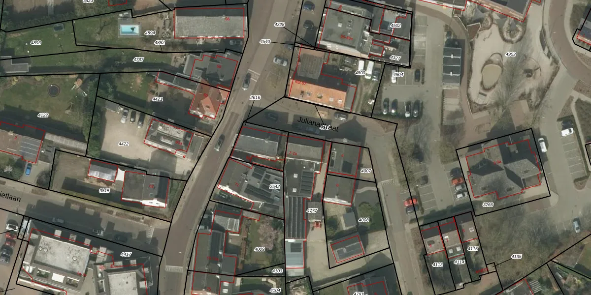 Het perceel waarop Julianastraat 2 staat heeft een oppervlakte van 833 m². Dit is een groot perceel. De perceeloppervlakte wordt geregistreerd door het Kadaster. Gedetailleerde informatie over de maten van dit perceel kunt u vinden in het rapport Kadastrale kaart met maatvoering van Julianastraat 2.