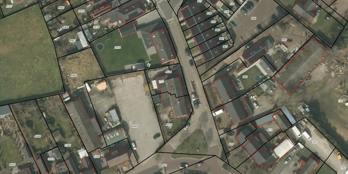 Julianastraat 28-a is gelegen op kadastraal perceel LDE01A4534. Deze kadastrale aanduiding is uniek en wordt gebruikt door het Kadaster om eigendomsrechten en andere zakelijke rechten vast te leggen. Het perceel maakt onderdeel uit van de kadastrale gemeente Leende.
