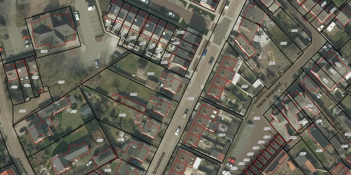 Het perceel waarop Schoolstraat 10 staat heeft een oppervlakte van 597 m². Dit is een groot perceel. De perceeloppervlakte wordt geregistreerd door het Kadaster. Gedetailleerde informatie over de maten van dit perceel kunt u vinden in het rapport Kadastrale kaart met maatvoering van Schoolstraat 10.