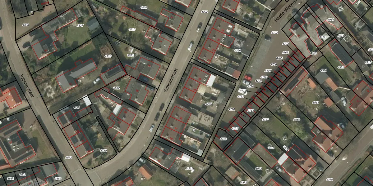 Schoolstraat 33 is gelegen op kadastraal perceel LDE01A4295. Deze kadastrale aanduiding is uniek en wordt gebruikt door het Kadaster om eigendomsrechten en andere zakelijke rechten vast te leggen. Het perceel maakt onderdeel uit van de kadastrale gemeente Leende.