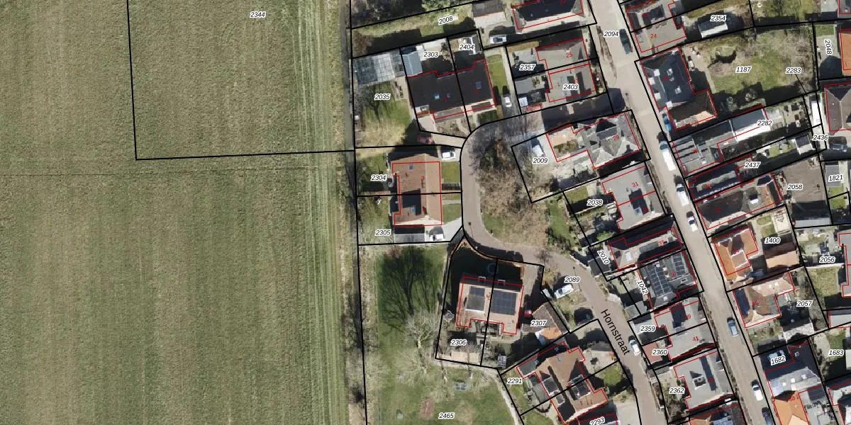 Hornstraat 4 is gelegen op kadastraal perceel LEE02B2305. Deze kadastrale aanduiding is uniek en wordt gebruikt door het Kadaster om eigendomsrechten en andere zakelijke rechten vast te leggen. Het perceel maakt onderdeel uit van de kadastrale gemeente Leens.