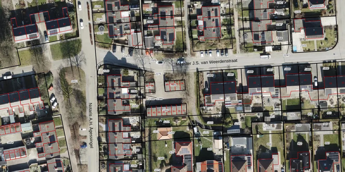 Het perceel waarop Meester J.S. van Weerdenstraat 9-M staat heeft een oppervlakte van 71 m². Dit is een klein perceel. De perceeloppervlakte wordt geregistreerd door het Kadaster. Gedetailleerde informatie over de maten van dit perceel kunt u vinden in het rapport Kadastrale kaart met maatvoering van Meester J.S. van Weerdenstraat 9-M.