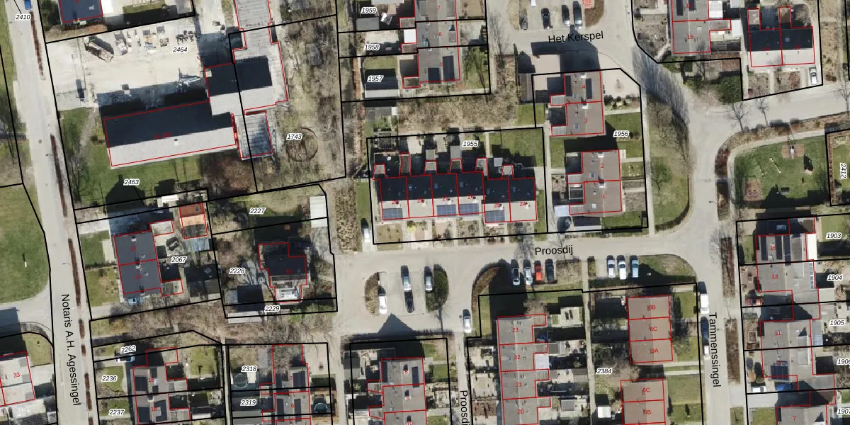 Het perceel waarop Proosdij 28 staat heeft een oppervlakte van 1034 m². Dit is een zeer groot perceel. De perceeloppervlakte wordt geregistreerd door het Kadaster. Gedetailleerde informatie over de maten van dit perceel kunt u vinden in het rapport Kadastrale kaart met maatvoering van Proosdij 28.