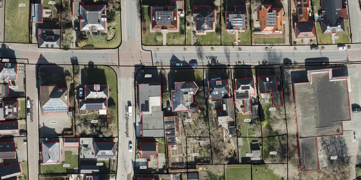 Valge 1 is gelegen op kadastraal perceel LEE02B2301. Deze kadastrale aanduiding is uniek en wordt gebruikt door het Kadaster om eigendomsrechten en andere zakelijke rechten vast te leggen. Het perceel maakt onderdeel uit van de kadastrale gemeente Leens.