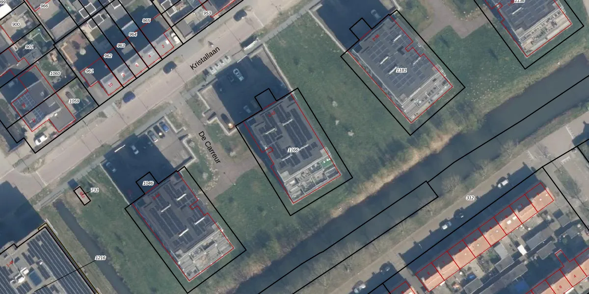 Het perceel waarop De Carreur 39 staat heeft een oppervlakte van 912 m². Dit is een groot perceel. De perceeloppervlakte wordt geregistreerd door het Kadaster. Gedetailleerde informatie over de maten van dit perceel kunt u vinden in het rapport Kadastrale kaart met maatvoering van De Carreur 39.