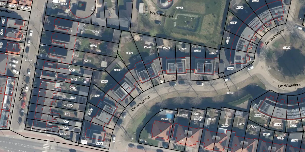 Het perceel waarop De Waterloop 13 staat heeft een oppervlakte van 380 m². Dit is een groot perceel. De perceeloppervlakte wordt geregistreerd door het Kadaster. Gedetailleerde informatie over de maten van dit perceel kunt u vinden in het rapport Kadastrale kaart met maatvoering van De Waterloop 13.