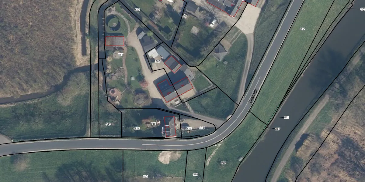 Het perceel waarop Diefdijk 15 staat heeft een oppervlakte van 545 m². Dit is een groot perceel. De perceeloppervlakte wordt geregistreerd door het Kadaster. Gedetailleerde informatie over de maten van dit perceel kunt u vinden in het rapport Kadastrale kaart met maatvoering van Diefdijk 15.