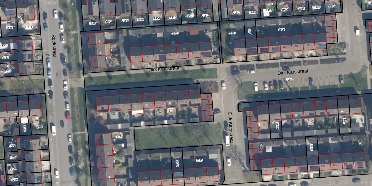 Het perceel waarop Dirk Karsstraat 16 staat heeft een oppervlakte van 2623 m². Dit is een zeer groot perceel. De perceeloppervlakte wordt geregistreerd door het Kadaster. Gedetailleerde informatie over de maten van dit perceel kunt u vinden in het rapport Kadastrale kaart met maatvoering van Dirk Karsstraat 16.