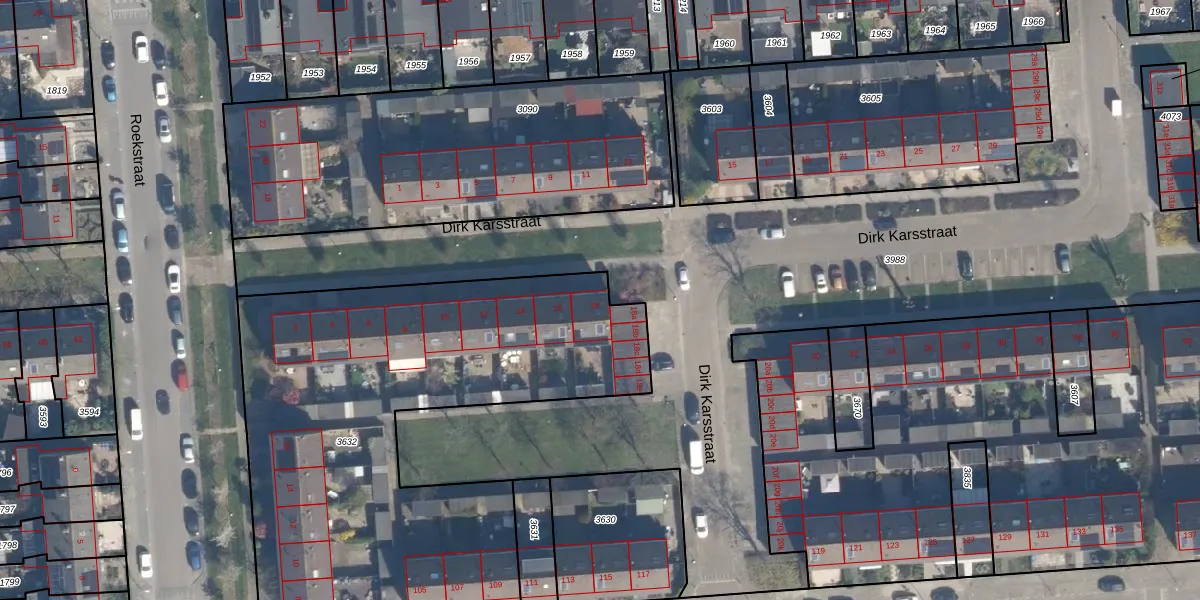 Het perceel waarop Dirk Karsstraat 18 staat heeft een oppervlakte van 2623 m². Dit is een zeer groot perceel. De perceeloppervlakte wordt geregistreerd door het Kadaster. Gedetailleerde informatie over de maten van dit perceel kunt u vinden in het rapport Kadastrale kaart met maatvoering van Dirk Karsstraat 18.