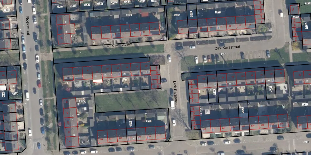 Het perceel waarop Dirk Karsstraat 18-c staat heeft een oppervlakte van 2623 m². Dit is een zeer groot perceel. De perceeloppervlakte wordt geregistreerd door het Kadaster. Gedetailleerde informatie over de maten van dit perceel kunt u vinden in het rapport Kadastrale kaart met maatvoering van Dirk Karsstraat 18-c.
