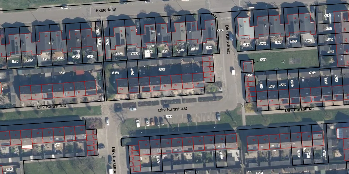 Het perceel waarop Dirk Karsstraat 25 staat heeft een oppervlakte van 940 m². Dit is een groot perceel. De perceeloppervlakte wordt geregistreerd door het Kadaster. Gedetailleerde informatie over de maten van dit perceel kunt u vinden in het rapport Kadastrale kaart met maatvoering van Dirk Karsstraat 25.