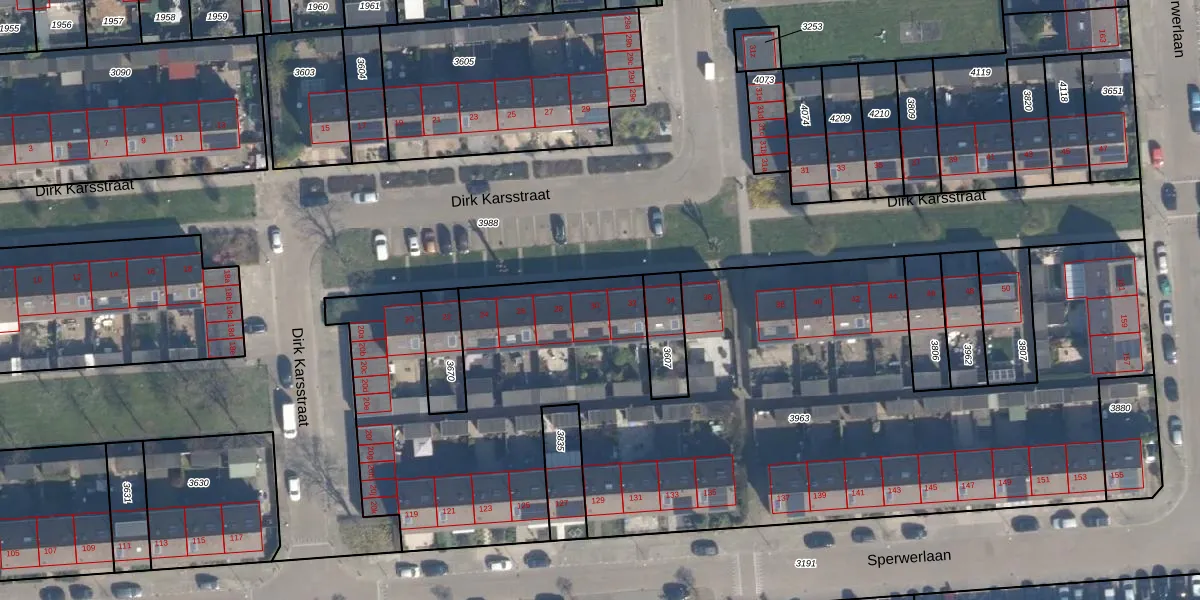 Het perceel waarop Dirk Karsstraat 30 staat heeft een oppervlakte van 4669 m². Dit is een zeer groot perceel. De perceeloppervlakte wordt geregistreerd door het Kadaster. Gedetailleerde informatie over de maten van dit perceel kunt u vinden in het rapport Kadastrale kaart met maatvoering van Dirk Karsstraat 30.
